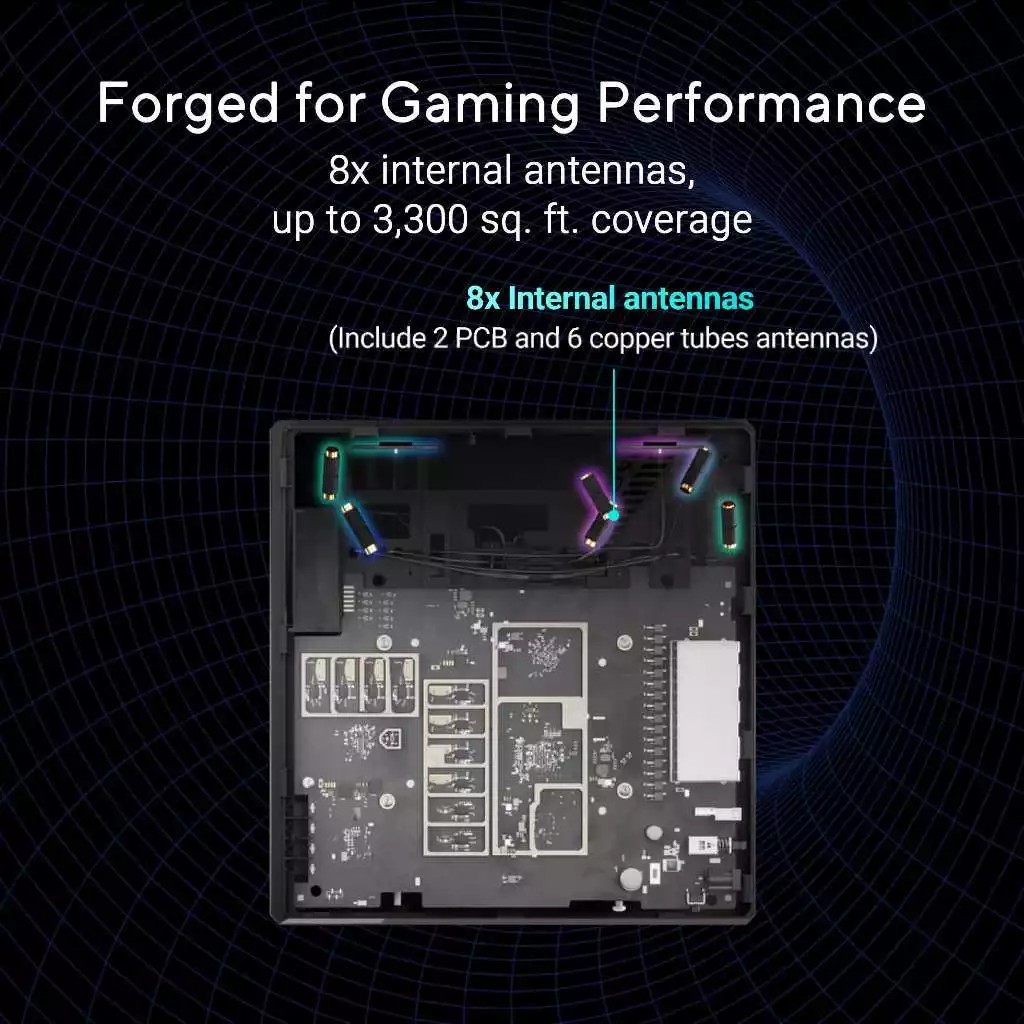 High-performance quad-core 2.0GHz CPU with robust cooling, 2GB RAM and eight internal antennas powered by independent FEMs provide range of up to 3300 sq. ft. and 4x4 MIMO gaming WiFi (5 GHz and 6 GHz only)